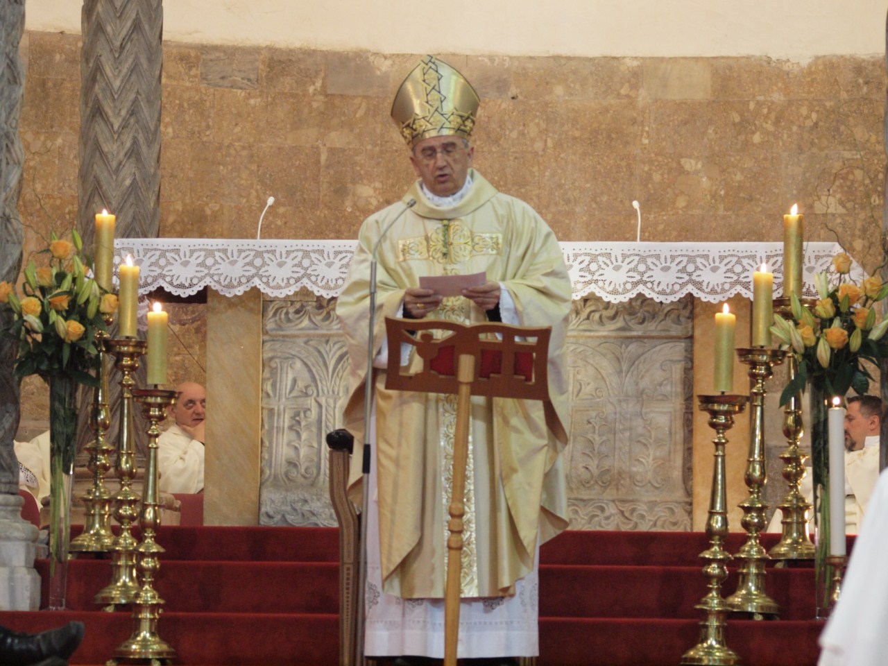Nadbiskup je istaknuo i da je to prva misa posvete ulja kojom se na poseban način povezujemo s novim Petrovim namjesnikom, papom Franjom. „On nas svojim osobitim stilom skromnosti i jednostavnosti potiče i poziva, s pouzdanjem u Kristove riječi, izvesti na pučinu. Obiljem svoga neuvjetovanog milosrđa Isus nas poziva djelovati u njegovo ime. Njegovo milosrđe prožeto je praštanjem koje nikad ne uskraćuje, kako ga nije uskratio ni Petru nakon njegove izdaje. Petar je primajući posebnu službu doživio i posebno Isusovo milosrđe. Petar je iznenađen toplinom Isusa čudotvorca koji njega grešnika obasipa darom milosrđa. Tako Petar od običnog ribara postaje ribarom ljudi, od grešnika poslužiteljem milosrđa“ rekao je mons. Puljić. Istaknuo je da se geslo pape Franje, kojim je želio istaknuti Božje smilovanje i milosrđe, dobro uklapa u razmišljanje o Božjem milosrđu.