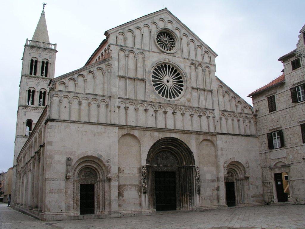 Zadarska katedrala izgrađena je u dva navrata, od 9. do 13. st., na temeljima starokršćanske bazilike iz 4. st. Iako prvotno posvećena apostolskom prvaku sv. Petru, od 9. st., otkad u njoj u sarkofagu počivaju moći sv. Stošije, prvostolnica nosi naziv te ranokršćanske mučenice. Najveća crkva u Dalmaciji je ta trobrodna romanička katedrala s prepoznatljivom rozetom na svom pročelju. Rese ga i kasnoromanički portali, a u gornjem dijelu malene arkade sa stupićima. Pohodili su je pape Aleksandar III. 1177. g. i Ivan Pavao II. 2003. g.