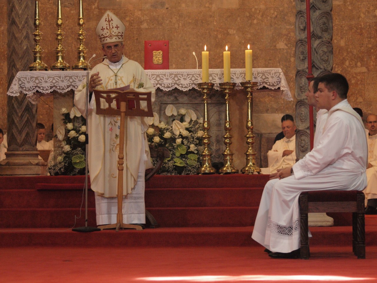 4. Kad sam vam kod đakonskog ređenja, na svetkovinu Krista Kralja prošle godine, predavao evanđelje, rekao sam: ‘Primi Kristovo evanđelje kojemu si postao navjestitelj. Nastoj vjerovati što čitaš, učiti što vjeruješ, te živjeti što druge učiš’. A danas, kad vam budem predavao darove što ih narod prinosi Bogu upozorit ću vas da ‘budete svjesni onoga što radite; da u djelo provedete što obavljate, te svoj život suobličujete otajstvu križa Gospodnjega’. Poželimo našim ređenicima, braćo i sestre, neka budu doista na visini zadataka koje im Crkva povjerava. Neka im molitva, posebice Božanskog časoslova, pomaže biti svjesni onoga što rade, kako bi druge učili što sami vjeruju, te se sve više suobličili otajstvu križa Gospodnjega.