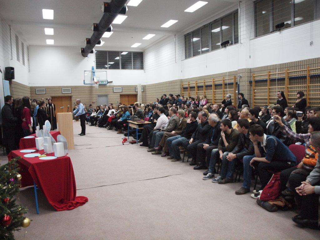 Na svečanosti je nastupio i Zbor Klasične Gimnazije Ivan Pavao II. pod ravnanjem Tomislava Pehara kojem su svi čestitali na uspjehu plasmana među 15 kvalificiranih sudionika u emisiji HTV-a ’Do posljednjeg zbora’. Održana je i humanitarna tombola ‘Da živi ljubav’ u kojoj su bili artikli kojih su se učenici odrekli a čijom su kupnjom osigurana sredstva za potrebne. Prikupljeni iznos cijele božićne večeri stavljen je u fond ‘Gorušičino zrno’ Klasične gimnazije iz kojeg se daju sredstva za pomoć učenicima iz socijalno ugroženih obitelji za vrijeme njihova pohađanja gimnazije i u nastavku školovanja. Trenutno se iz tog Fonda stipendira dvoje studenata u Zagrebu i jedan u Splitu, bivši gimnazijalci. “Počeli smo skromno, ali Bog je umnožio našu ljubav, davanje i učinio da gorušičino zrno raste. U tom će gnijezdu rasti mnogi ljudi” rekao je mons. Kokić zahvalivši dobročiniteljima koji pomažu rad Fonda, plemenite i jedinstvene gimnazijske inicijative učenika i uprave škole.