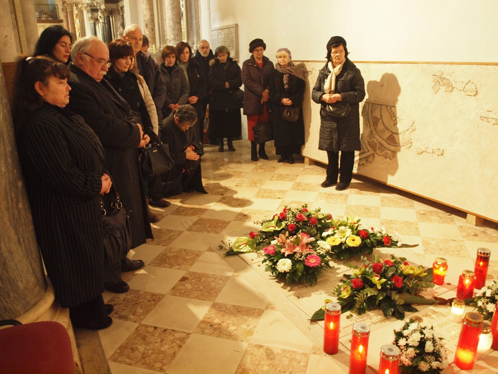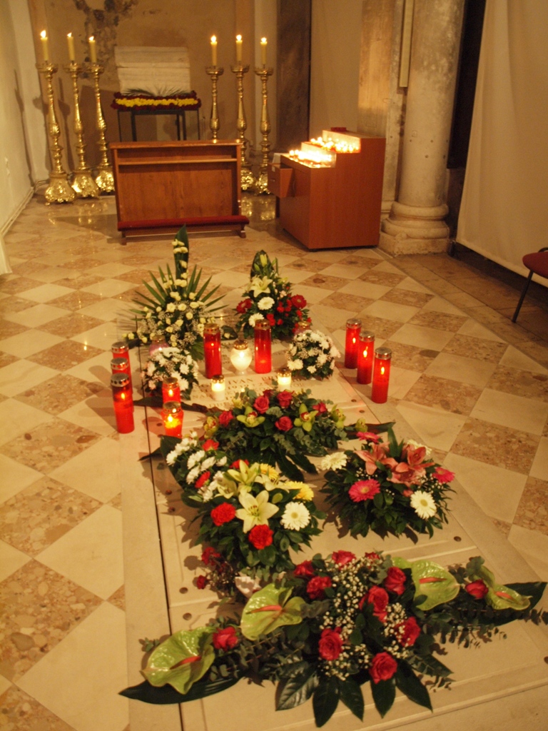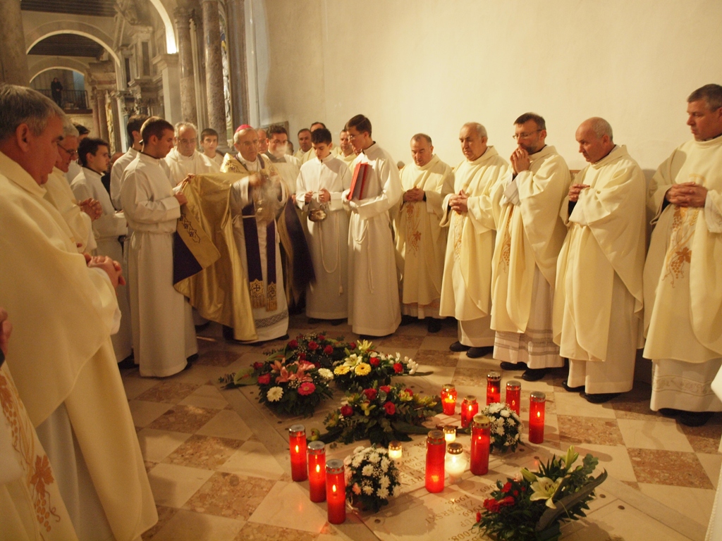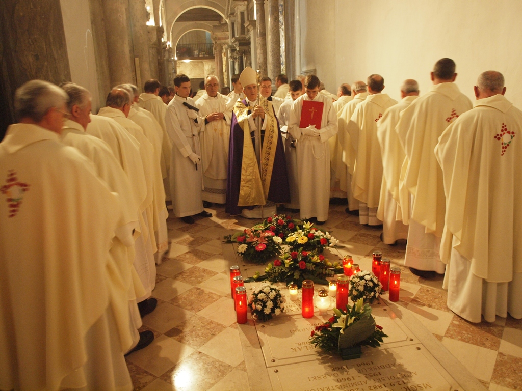 Nakon mise, mons. Puljić, svećenici, svi u misnicama sa znakom SHKM-a Zadar koji je bio posljednje veliko pastoralno djelo blagopokojnog nadbiskupa i brojni puk, pomolili su se na grobu nadbiskupa Prenđe u grobnici zadarskih nadbiskupa u sjevernoj pokrajnjoj lađi katedrale sv. Stošije.